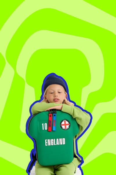 Child with a red cabin luggage and blue backpack standing in front of a Chelsea Football Club sign.